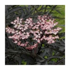 An exceptionally fine form of ornamental elder, with dark purple and finely cut foliage, with pink flowers in early summer. Best gown in full sun to keep the dark colouring.